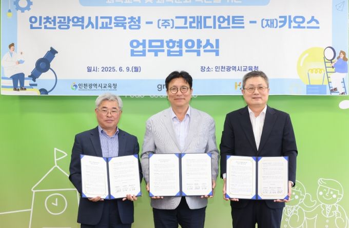 [경남도민뉴스=김용욱 기자] 인천광역시교육청은 ㈜그래디언트(대표 남인봉), 재단법인 카오스와 과학교육 및 과학 문화 확산을 위한 업무협약을 체결하고, 미래 과학 인재 양성을 위한 협력체계를 본격 구축한다고 10일 밝혔다.