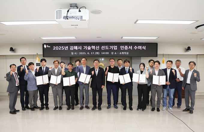 [경남도민뉴스=최미정 기자] 김해시는 17일 시청 소회의실에서 김해 전략산업과 미래기반산업을 이끌 2025 김해형 기술혁신 선도기업 8개사에 인증서를 수여했다.