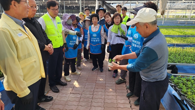 이날 일손돕기에는 NH농협 거창군지부, 남거창농협, 거창군 농가주부모임 회원, 법무부 거창준법지원센터 임직원 및 사회봉사대상자 등 40여명이 동참하여 일손이 부족한 화훼농가에서 국화 모종 삽목 작업 및 상토작업과 화훼하우스 농경지 주변에서 영농폐기물 수거 등을 도왔다.