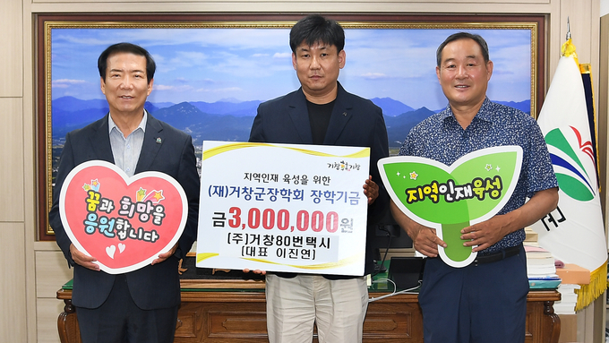 ㈜거창80번택시(대표 이진연)는 일반택시 운영 이외에도 중증 보행장애인 등을 위한 특별교통수단과 농어촌버스 미운행 마을 대상 브라보·부르미 택시 등을 운영하며 주민의 이동권 확보와 교통 복지 실현에 앞장서고 있으며, 올해 처음으로 지역 학생들의 학업 증진과 꿈을 응원하고자 올해 처음으로 장학회에 300만 원을 쾌척하였다.