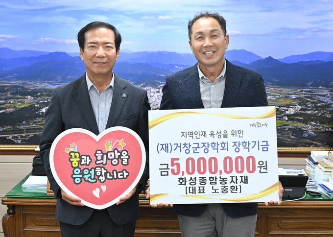화성종합농자재(대표 노충환)는 거창읍 대동리에서 농자재를 취급·판매하고 있다. 기탁식에 참석한 노 대표는 “경제적 어려움 없이 학생들이 꿈을 펼치길 바라는 마음으로 사업 수익금의 일부인 500만 원을 처음 기부하게 됐다. 앞으로도 거창군의 장학사업에 관심을 갖겠다”라고 기부 소감을 밝혔다.