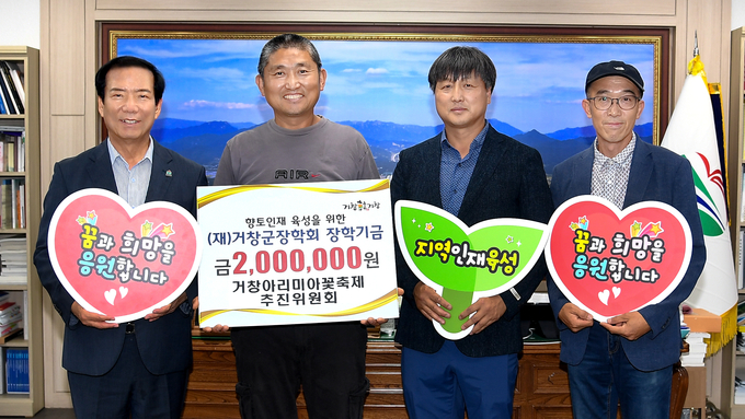 거창아리미아꽃축제 추진위원회(위원장 김성영)도 ‘거창에 On 봄 축제’의 5개 테마형 축제 중 하나인 ‘거창 아리미아꽃축제’를 통해 얻은 수익금을 지역의 기부 문화 확산에 동참하고자 200만 원을 장학금으로 기부했다.