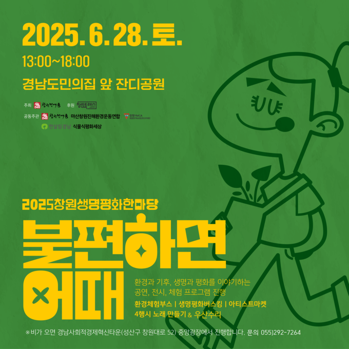 [경남도민뉴스=구인애 기자] 창원민예총이 주최하는 '2025 창원생명평화한마당'이 오는 토요일 경남도민의집 앞 잔디공원에서 열릴 예정이다. 이번 행사는 '불편하면 어때'라는 주제로 진행되며, 환경과 생명, 기후평화를 주제로 다양한 프로그램이 마련된다. 창원민예총과 여러 지역 단체가 공동으로 주관하고 창원시가 후원하는 이번 행사는 6회째를 맞이하여 더욱 풍성한 내용으로 참가자들을 맞이할 예정이다.