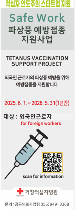 [경남도민뉴스=백형찬기자] 거창적십자병원(원장 최준)은 농촌 지역의 외국인 계절근로자를 대상으로 파상풍 예방접종을 지원하는‘세이프 워크(Safe Work) 예방접종 지원사업’을 2025년 6월 1일부터 추진하고 있다.