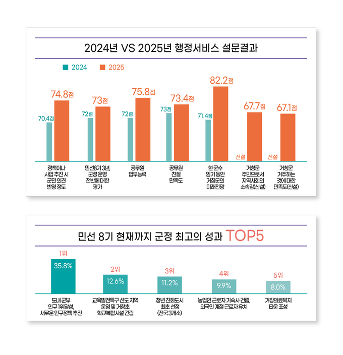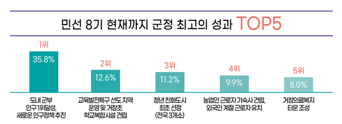 민선 8기 주요사업 18개에 대한 현재까지 군정 최고의 성과를 조사한 결과, △도내 군부 인구 1위 달성, 새로운 인구정책 추진 △교육발전특구 선도 지역 운영 및 거창초 학교복합시설 건립 △청년 친화도시 최초 선정(전국 3개소) △농업인 근로자 기숙사 건립, 외국인 계절 근로자 유치 △의료복지타운 조성 순으로 응답 비율이 나타났다.