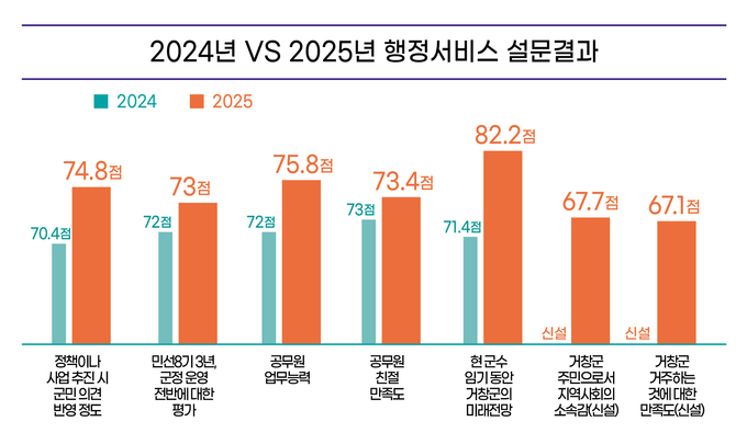 [경남도민뉴스=백형찬 기자] 거창군은 민선 8기 3주년을 맞아 군정 전반에 대한 군민 만족도를 확인하고, 주요 정책과 사업에 관한 관심도 및 향후 정책 수요를 파악하기 위해 지난 5월 23일부터 6월 10일까지 전문 여론조사기관 알앤에스를 통해 '2025 거창군 행정서비스 만족도 및 수요조사'를 실시했다.