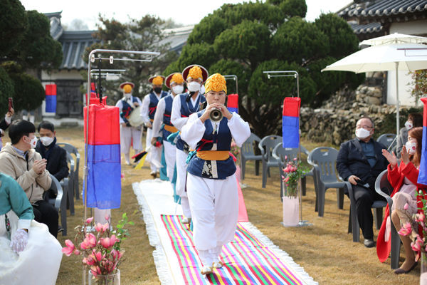 코로나19 확산 방지를 위해 철저한 방역수칙을 준수한 가운데 진행된 이날 전통혼례는 사대관모를 차려입은 신랑과 연지곤지를 찍고 족두리로 치장 한 신부가 전통혼례 순서에 따라 혼례를 통해 백년가약을 약속하며 평생 잊지 못할 아름다운 추억을 만들었다.