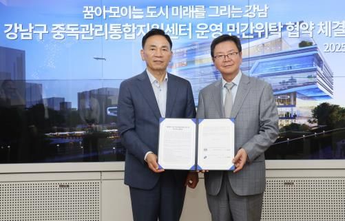 [경남도민뉴스=김완호 기자] 꿈이 모이는 도시, 미래를 그리는 강남구가 6월 30일 구청 본관에서 가톨릭대학교 서울성모병원(병원장 윤승규)과 중독관리통합지원센터 운영을 위한 민간위탁 협약을 체결하고, 중독 문제에 선제적으로 대응할 지역 기반 마련에 나섰다.