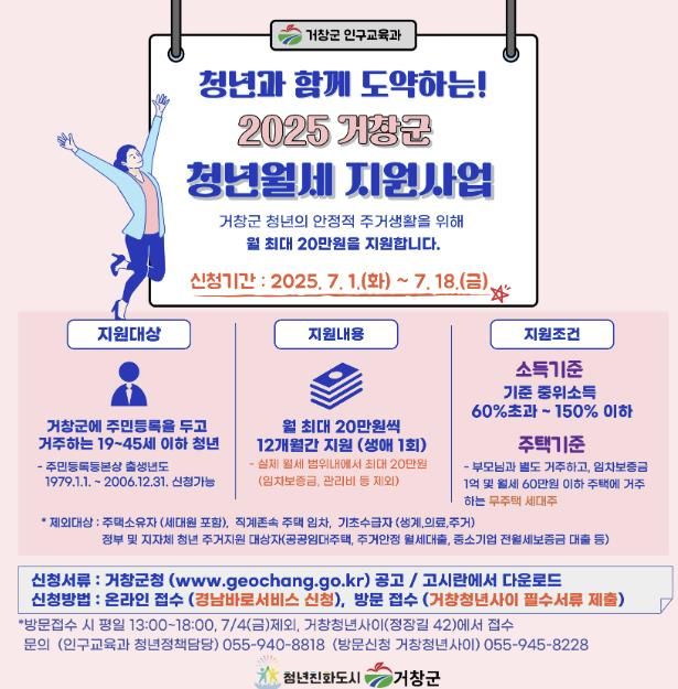 지원대상은 공고일 기준 거창군에 주소를 두고 있는 19세 이상 45세 이하 청년 세대주로, 소득 기준은 중위소득 60% 초과 150% 이하이다. 또한, 임차보증금 1억 원 이하 및 월 임차료 60만 원 이하 주택에 거주하는 부모와 별도 거주하는 무주택자여야 한다.