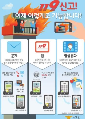 119 다매체 신고서비스는 문자, 영상통화, 스마트폰 앱 등을 통해 신고할 수 있는 체계로 청각장애인과 외국인 등 음성 통화가 어려운 사람들도 긴급 상황을 신속히 전달할 수 있다.