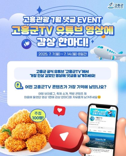 이번 이벤트는 고흥군 공식 관광 SNS 활성화와 온라인 소통 강화를 위해 마련됐으며, 참여자 중 총 100명을 추첨해 치킨 세트를 증정한다.