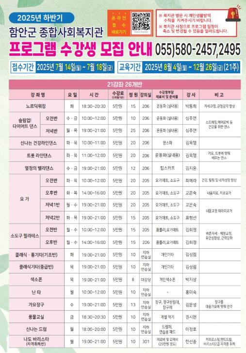 [경남도민뉴스=권중환 기자] 함안군 종합사회복지관은 군민들의 건전한 여가선용과 지역사회 복지향상을 위해 오는 14일부터 18일까지 2025년 하반기 프로그램 수강생을 모집한다.