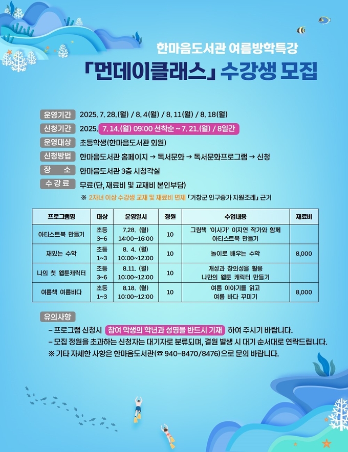 수강 신청은 프로그램 중복신청이 가능하고, 7월 14일부터 한마음도서관 홈페이지를 통해 신청할 수 있다.