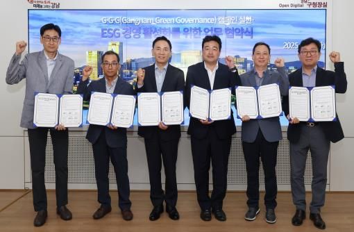 [경남도민뉴스=김완호 기자] 꿈이 모이는 도시, 미래를 그리는 강남구가 7월 8일 구청에서 관내 대형 건축공사장의 시공사 5곳과 ‘G.G.G.(Gangnam Green Governance) 실천 캠페인 및 ESG 경영 활성화를 위한 공동 협약’을 체결했다. 협약에 참여한 기업은 삼성물산, CJ대한통운, GS건설, 현대건설, 효성중공업이다.
