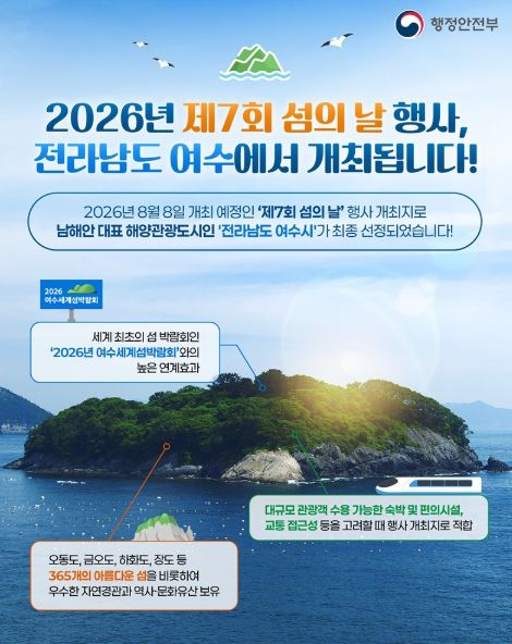 [경남도민뉴스= 기자] 2026년 8월 8일 개최 예정인 '제7회 섬의 날' 행사 개최지로 남해안 대표 해양관광도시인 '전라남도 여수시'가 최종 선정되었습니다!