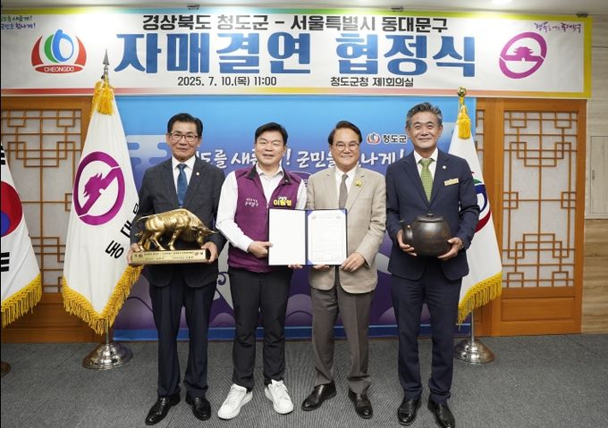 [경남도민뉴스=윤장희 기자] 서울 동대문구와 경상북도 청도군이 7월 10일 청도군청에서 자매결연 협정을 체결하며 두 지역 간 지속가능한 상생협력의 토대를 마련했다.