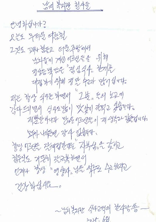 해당 편지에는 ‘남지복지관 천사들’이라는 제목 아래, 무더위 속에서도 정성껏 식사를 준비하는 직원들의 노고에 대한 감사와 응원의 메시지가 담겨 있었다.