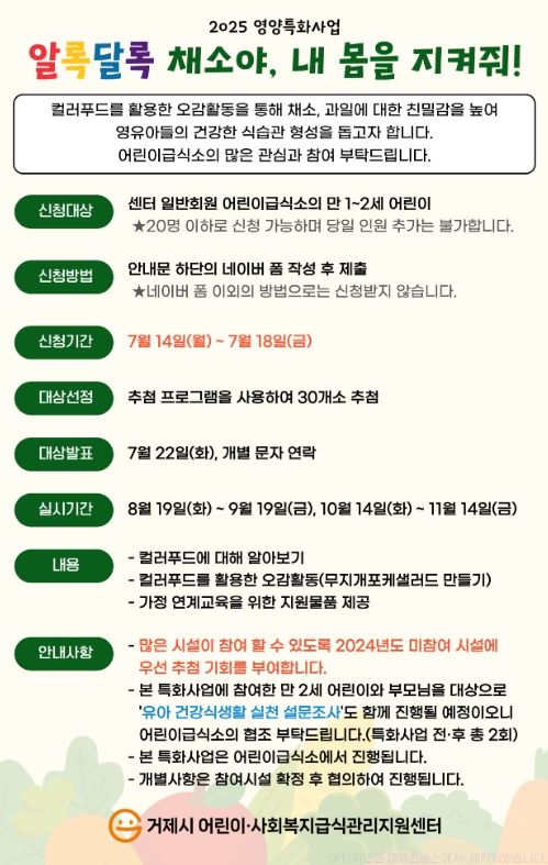 [경남도민뉴스=김부경 기자] 거제시 어린이·사회복지급식관리지원센터(센터장 황경순)는 지난해 높은 호응을 얻은 영양 특화사업 ‘알록달록 채소야, 내 몸을 지켜줘!’를 올해 확대 운영한다고 밝혔다.