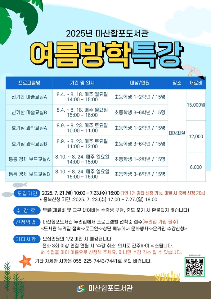 정진성 마산합포도서관과장은 “아이들이 방학 동안 도서관에서 즐겁고 유익한 시간을 보내고, 새로운 분야에서 흥미와 호기심을 키울 수 있도록 다양한 프로그램을 준비했다”며, “앞으로도 지역 아동들을 위한 문화·교육 프로그램을 지속적으로 운영해 나가겠다”고 밝혔다.