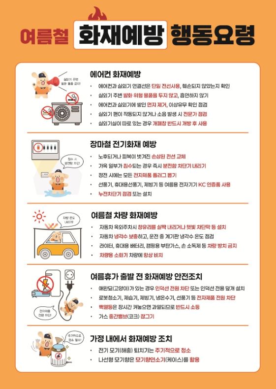 주요 행동요령으로는 ▲에어컨 전선은 단일 전선을 사용하고 손상되면 즉시 교체 ▲실외기 주변 먼지 제거 및 가연물 두지 않기 ▲장마철 침수 시 분전함 차단기 내리기 ▲정전 시 전자제품 전원 뽑기 ▲KC 인증제품 사용하기 ▲장시간 외출 전 전자제품 전원 차단과 가스 밸브 잠그기 등이다.