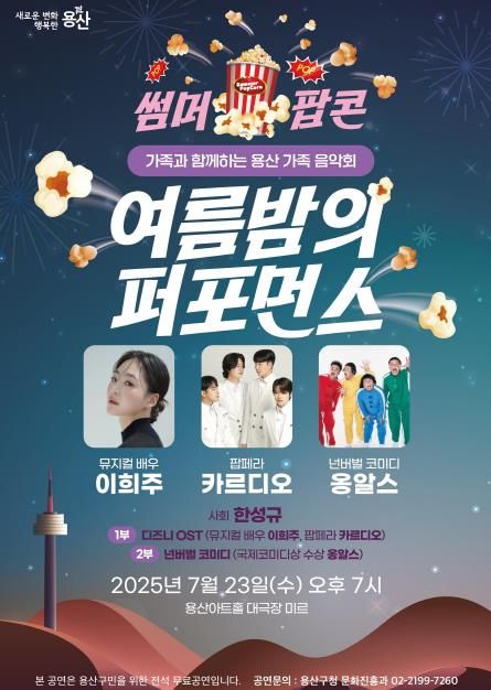 [경남도민뉴스= 기자] 서울 용산구가 오는 23일 오후 7시 용산아트홀(녹사평대로 150) 대극장 미르에서 여름맞이 기획공연 ‘썸머팝콘: 여름밤의 퍼포먼스’를 개최한다.