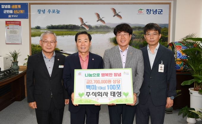 [경남도민뉴스=김병현 기자] 창녕군은 ㈜태성 김세원 대표로부터 지난 16일 관내 저소득 취약계층을 위한 백미(10kg) 100포를 기탁받았다고 밝혔다.