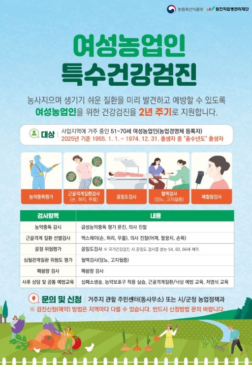 군 관계자는 “이번 검진은 일반국가검진과는 다른 특수건강검진으로, 여성 농업인의 농작업 관련 질환을 예방하고 조기 발견하는 데 도움이 된다”라며, “아직 신청하지 못한 여성농업인께서도 신청해서 건강을 지키는 계기가 되길 바란다”라고 말했다.