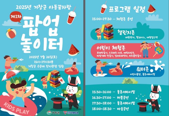 이번 1차 팝업놀이터는 거창군제연극제 기간 중 개최되며, 아동의 놀 권리 보장과 건강한 놀이문화 활성화를 통한 아동친화도시 조성 일환으로 추진되며, 초등 저학년 이하의 아동과 보호자들이 무료로 이용할 수 있다.