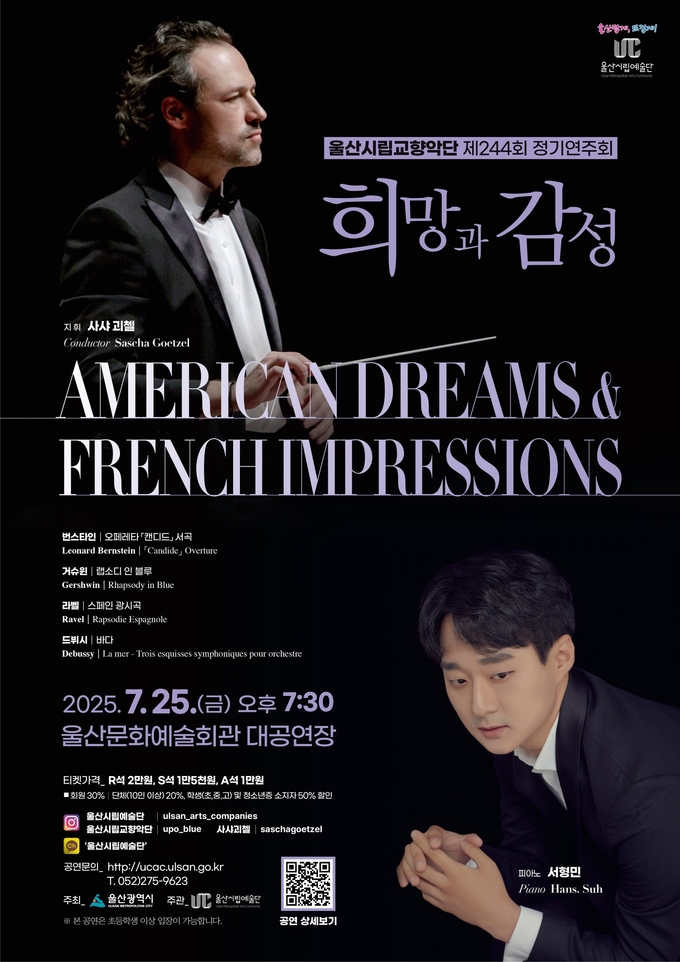 [경남도민뉴스=최재경 기자] 울산시립교향악단은 오는 7월 25일 오후 7시 30분 울산문화예술회관 대공연장에서 제244회 정기연주회 ‘희망과 감성(American Dreams · French Impressions)’을 무대에 올린다.
