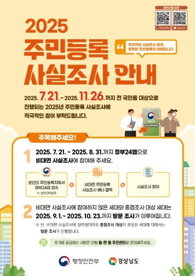 [경남도민뉴스=구인애 기자] 경상남도는 7월 21일부터 11월 26일까지 ‘2025년 주민등록 사실조사’를 실시한다.