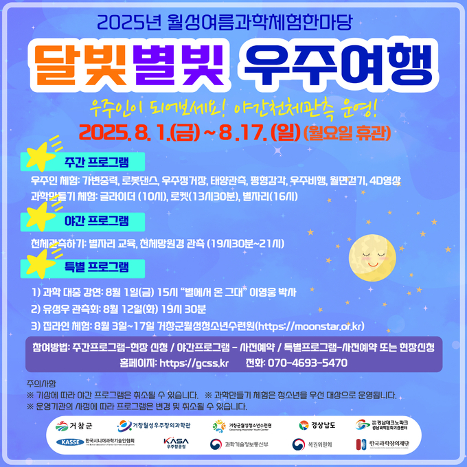 [경남도민뉴스=백형찬 기자] 거창군은 8월 1일부터 17일까지 거창월성우주창의과학관에서 우주에 대한 주제로 “달빛별빛 우주여행”을 운영한다고 밝혔다.