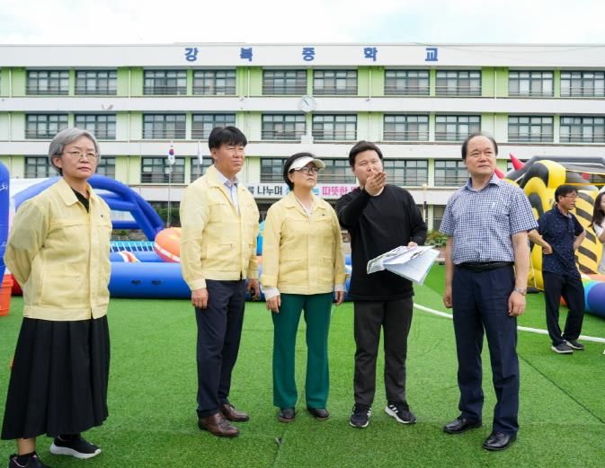 이날 이 구청장은 관계부서 공무원은 물론 강북경찰서, 강북소방서, 한국전기안전공사 등 유관기관 관계자 등과 함께 물놀이장이 운영될 송천초등학교와 강북중학교를 방문해, 물놀이장 설치 현황을 꼼꼼히 살폈다.