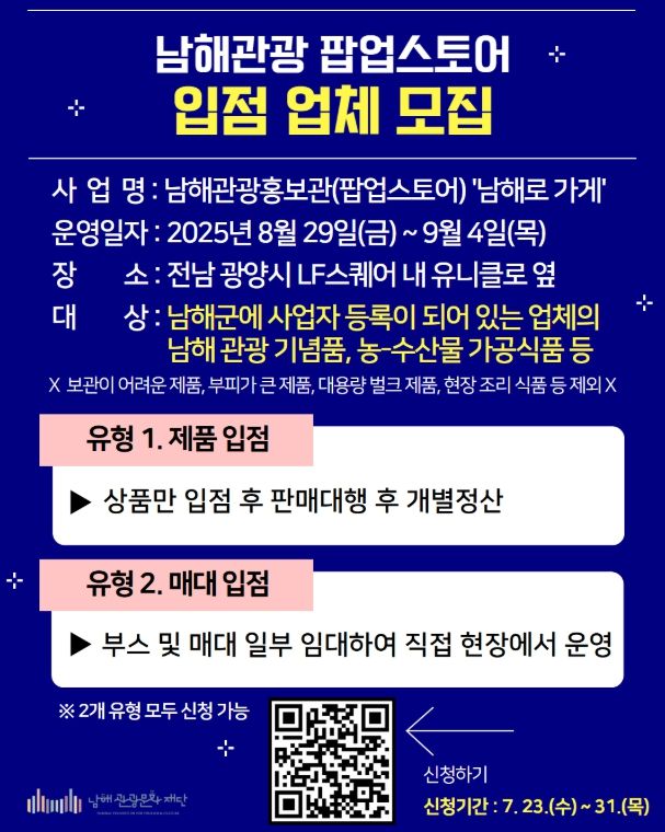 남해관광문화재단 김용태 대표이사는 “이번 홍보관은 단순한 단기 홍보를 넘어, 남해군 관광사업체들의 외부 판로 개척과 브랜드 확장의 시작점이 될 것”이라며, “남해와 가까운 도시에서 소비자와 직접 만나고 싶은 남해 로컬 브랜드의 적극적인 참여를 기대한다”고 밝혔다.