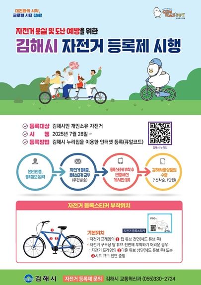 자전거 등록제는 2008년부터 시행됐으나 낮은 등록률 등으로 2023년 하반기 잠정 중단된 후 지난해 국민권익위원회의 자전거 등록제 활성화 권고와 등록자 혜택을 뒷받침하는 ‘김해시 자전거 이용 활성화에 관한 조례’ 개정을 기반으로 재개됐다.