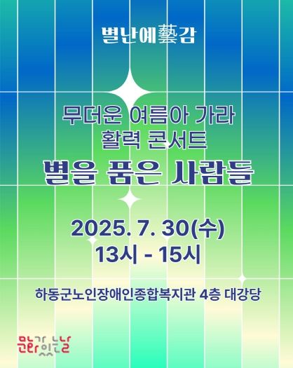[경남도민뉴스=김태수 기자] 하동군이 오는 30일 13시, 하동노인장애인종합복지관에서 ‘2025 문화가 있는 날 '구석구석 문화배달' - 별난예(藝)감! 별을 품은 사람들’ 행사를 개최한다.