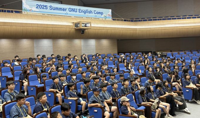 [경남도민뉴스=구인애 기자] 경상국립대학교는 여름방학을 맞이하여 (재)경상남도장학회, 창녕군, 합천군 위탁으로 ‘2025 여름 GNU 영어캠프’를 운영한다. 캠프생 입소식은 7월 27일 오전 가좌캠퍼스 언어교육실 파이어니어 오디토리엄에서 열렸다.