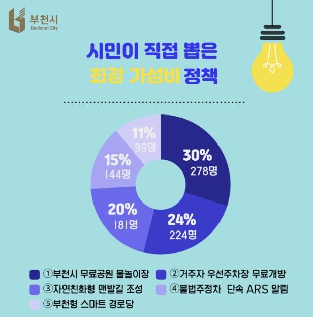 공모는 지난 6월 19일부터 7월 2일까지 2주간 진행됐으며, 약 900건의 의견이 접수돼 높은 관심을 모았다. 시민 투표 결과, 5대 가성비 정책으로는 △무료 공원 물놀이장 운영(30%) △거주자 우선 주차장 무료 개방(24%) △자연 친화형 맨발길 조성(20%) △불법주정차 단속 ARS 알림 서비스(15%) △부천형 스마트 경로당(11%)이 선정됐다.