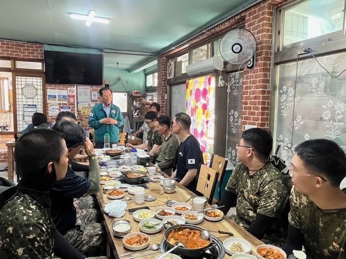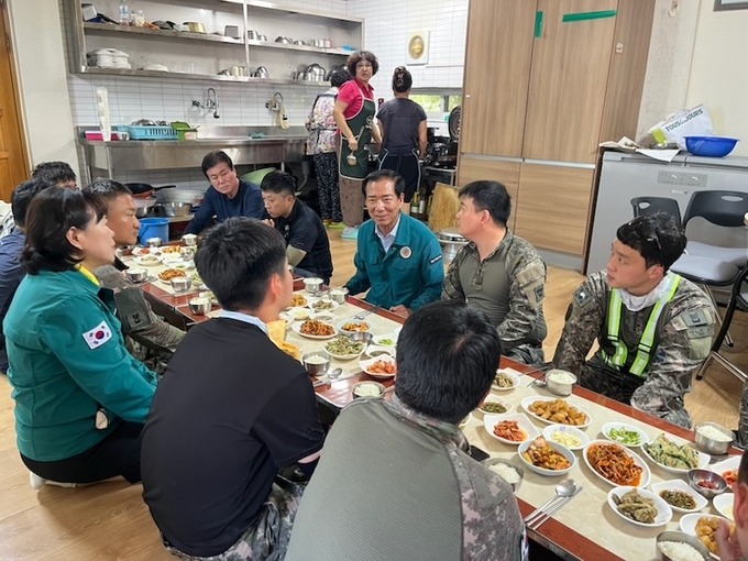 [경남도민뉴스=백형찬 기자] 구인모 거창군수는 29일에 집중호우로 피해가 있는 신원면에서 대민 지원을 하는 제39보병사단 용호여단 함양산청거창대대(대대장 중령 박상규) 장병 16명을 찾아 격려했다.
