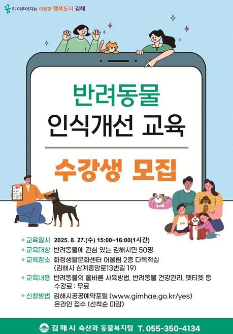 [경남도민뉴스=최미정 기자] 김해시는 올바른 반려동물 문화 조성을 위해 오는 8월 27일 화정생활문화센터 어울림 다목적실에서 시민 대상 ‘반려동물 인식개선 교육’을 실시한다고 30일 밝혔다.