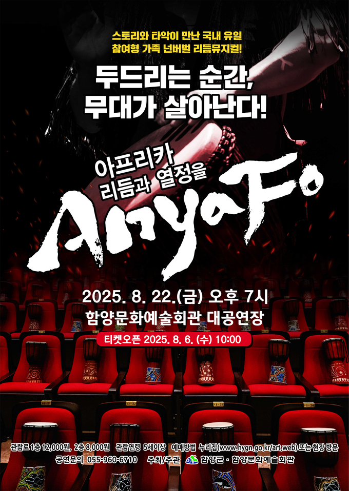 함양문화예술회관 관계자는 “아프리카의 다채롭고 생동감 넘치는 퍼포먼스와 젬베의 폭발적인 에너지가 어우러져 무더운 여름밤을 시원하게 날려줄 특별한 시간이 될 것”이라며 많은 관심과 성원을 당부했다.
