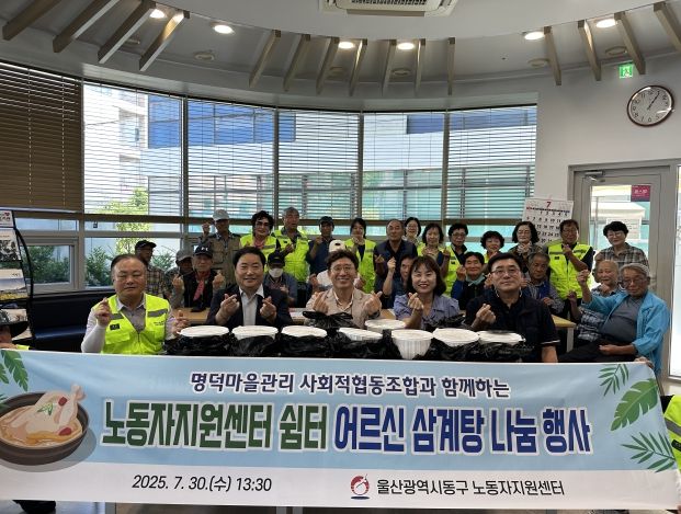 [경남도민뉴스=최재경 기자] 명덕 마을관리 사회적협동조합은 7월 30일 오후 1시 30분에 동구 노동자지원센터 내 1층 어르신 쉼터에서 지역 퇴직자 어르신들을 위해 준비한 삼계탕 밀키트 나눔 행사를 가졌다.