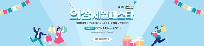 [경남도민뉴스=장강동 기자] 의성군은 오는 8월 1일부터 9월 30일까지 두 달간, 온라인 농특산물 쇼핑몰 ‘의성장날’에서 ‘제3회 의성세일페스타’를 개최한다고 밝혔다.