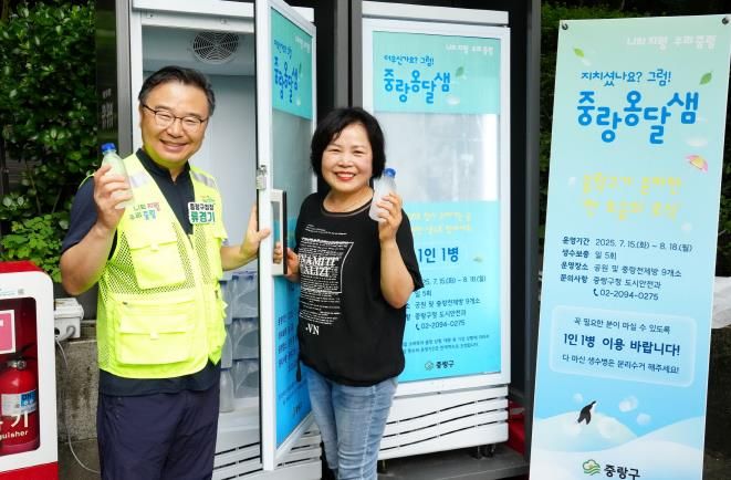 생수 냉장고 ‘중랑옹달샘’도 주민들에게 큰 호응을 얻고 있다. 지난 7월 15일부터 공원과 중랑천 제방 등 9개소에서 운영 중이며, 8월 18일까지 총 35일간 야외 활동 중인 주민들에게 1일 1만 2천 병의 시원한 생수를 제공한다.