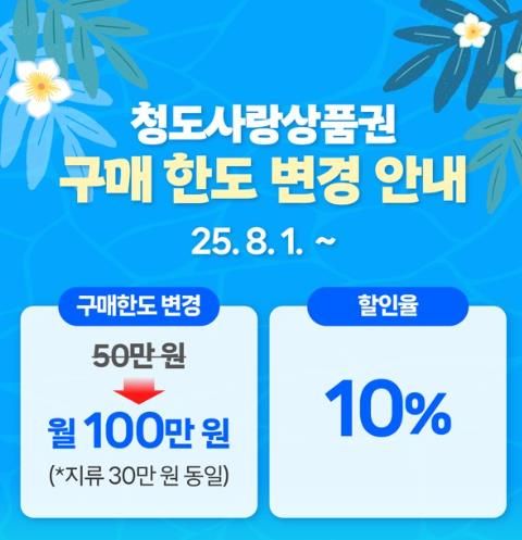 [경남도민뉴스=최민숙 기자] 청도군은 군민들의 소비 여력을 높이고 지역경제 활성화를 위해 오는 8월 1일부터 청도사랑상품권의 월 구매한도를 기존 50만원에서 100만원으로 상향한다고 밝혔다.