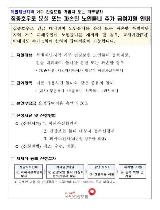 지원 대상은 특별재난지역에 거주하는 건강보험 가입자 또는 피부양자 중, 65세 이상 노인틀니 등록자로서 집중호우로 인해 긴급 대피하는 과정에서 틀니를 분실하거나 파손한 경우이다.