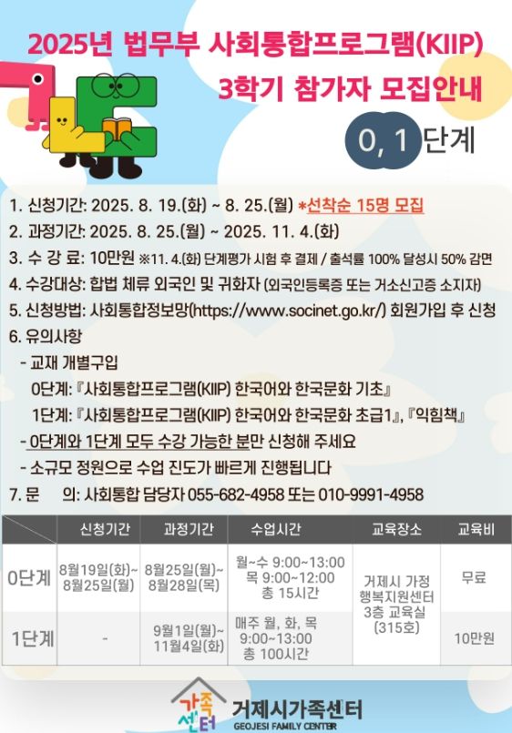 [경남도민뉴스=김부경 기자] 거제시가족센터(센터장 류주진)는 법무부 주관 ‘2025년도 사회통합프로그램(KIIP)’ 2학기 2단계와 5단계(기본) 과정을 성공적으로 마무리하고, 오는 8월 19일 화요일부터 3학기 수강생을 모집한다고 밝혔다.