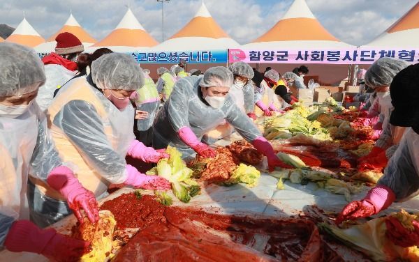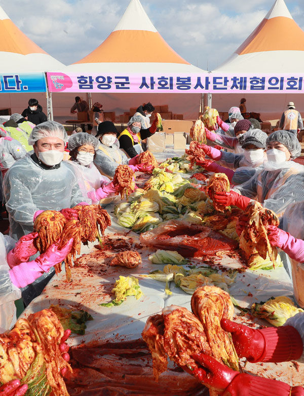 [경남도민뉴스] 함양군사회봉사단체협의회(회장 박동서, 임순남)는 1일 오후 공설운동장에서 봉사단체 회원들이 참석한 가운데 2021년 사랑의 김장나눔 봉사를 실시하였다.
