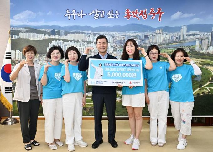 [경남도민뉴스=최재경 기자] 영웅시대 with HERO 울산따라따라가 8월 8일 오전 11시 중구청 구청장실에서 울산사회복지공동모금회를 통해 지역 복지시설인 국민요양원에 이웃돕기 후원금 500만 원을 지정기탁했다.