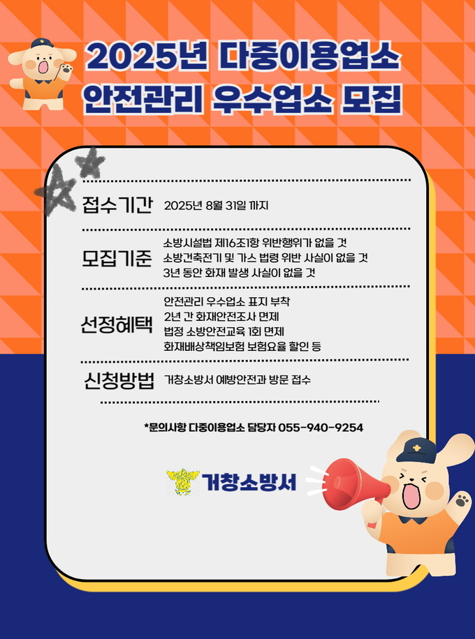 [경남도민뉴스=백형찬 기자] 거창소방서(서장 강호봉)는 오는 8월 31일까지 ‘2025년 다중이용업소 안전관리 우수업소’ 선정을 위한 신청을 접수받는다고 11일 밝혔다.