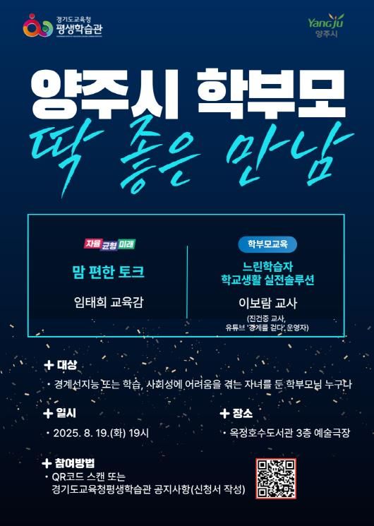오는 19일부터 10월 25일까지 진행되는 이번 프로그램은 평생학습관은 지역의 평생교육 활성화와 학부모교육 확대를 위해 협약을 체결한 기기관(양주·수원·오산시)을 거점으로 진행된다.